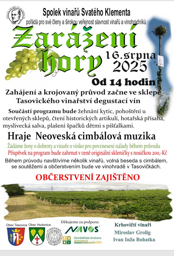 Spolek vinařů Svatého Klementa pořádá pro své členy a širokou veřejnost slavnost vinařů a vinohradníků „Zarážení hory“ 16. srpna 2025 od 14 hodin.